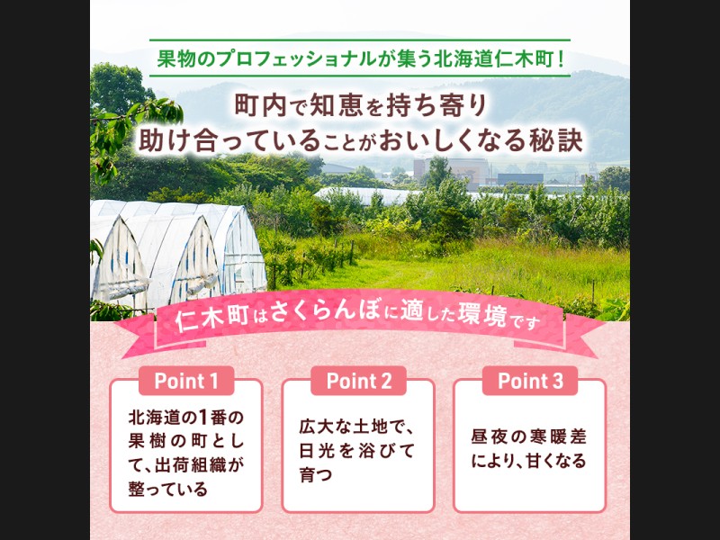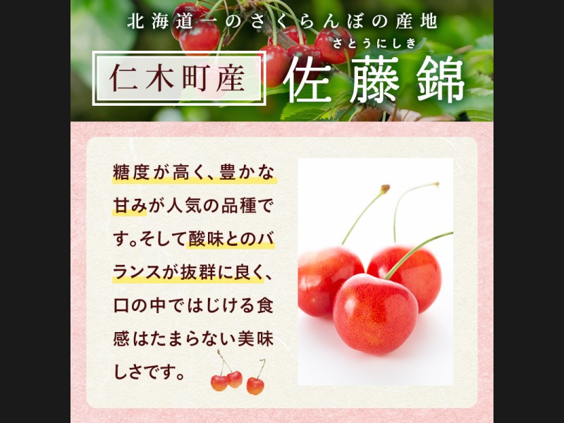 丹精込めて育てるさくらんぼの中から、人気の高い品種【佐藤錦】を、一粒一粒丁寧に選んでお届け致します。
