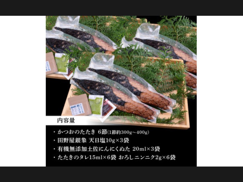 ・かつおのたたき3節(1節:約300g~400g)、田野屋銀象 天日塩10g×3袋、たたきのタレ15ml×3袋、おろしニンニク2g×3袋