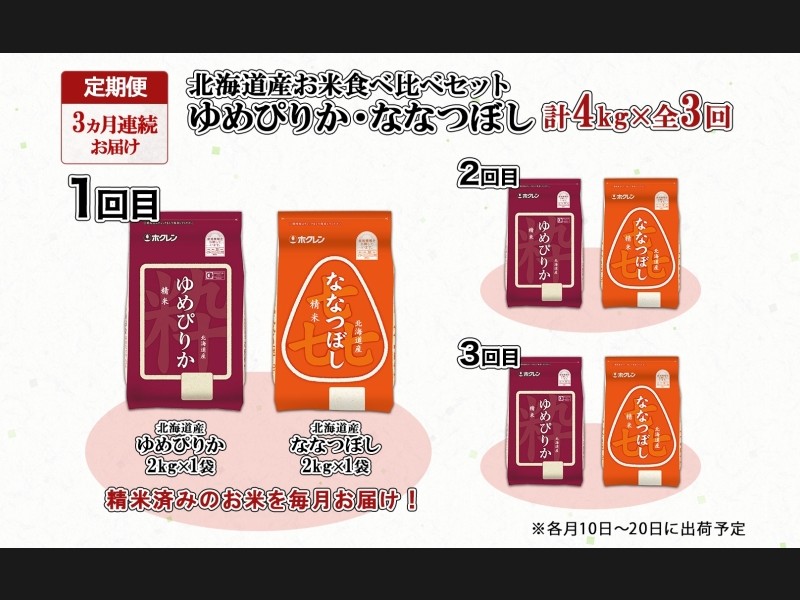 定期便 3ヵ月連続3回 北海道産 ゆめぴりか 喜ななつぼし 食べ比べ セット 精米 各2kg 計4kg 米 特A 白米...
