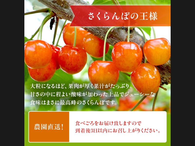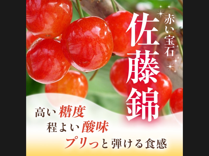 【品種:佐藤錦】赤い宝石と呼ばれ、程よい酸味は甘味を引き立て、見た目や味ともにさくらんぼと言えばという品種です。