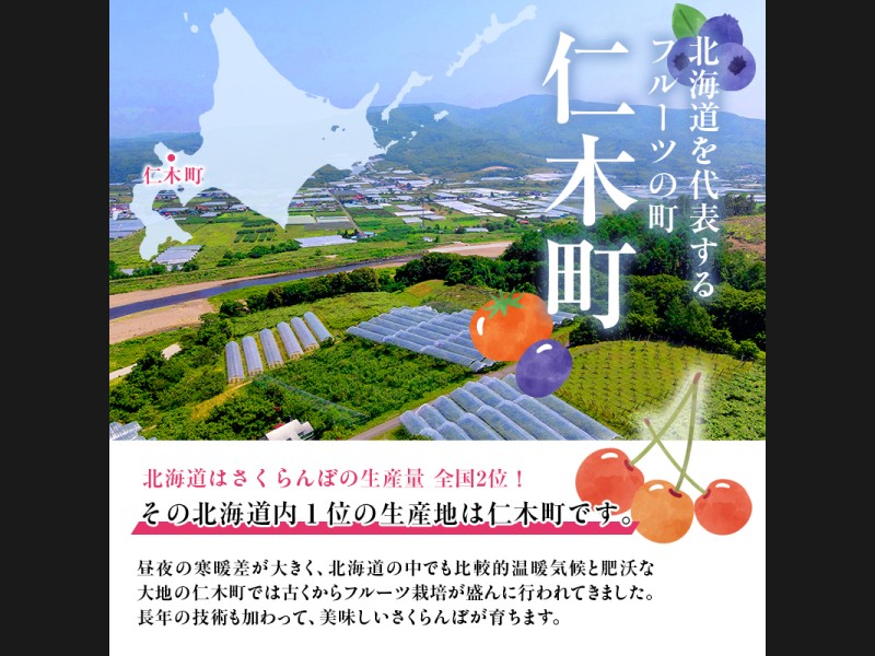 北海道仁木町の農園≪さくらんぼヶ丘 niki house≫では、とても多くの時間と作業を行い丁寧に育てています。収穫される「さくらんぼ(品種:佐藤錦)」の中から、Lサイズ(22mm)以上の果実を選んでお届け致します。