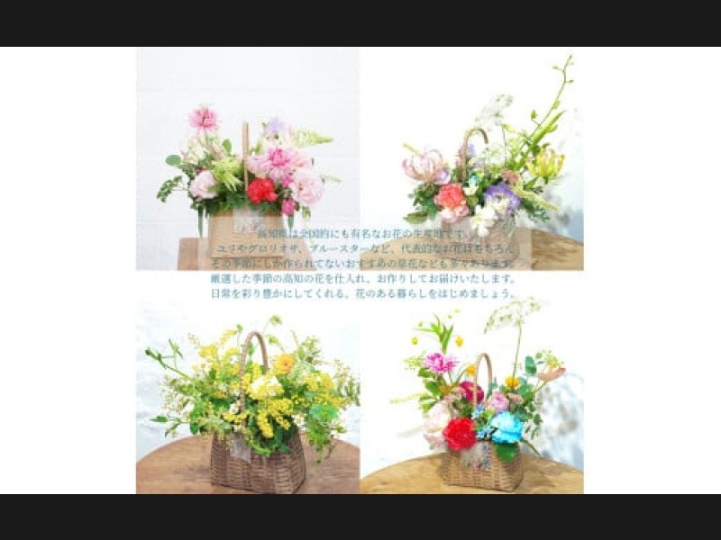 お花が好きなスタッフ達がひとつひとつ想いをこめて丁寧にお作りしています。バスケットは、高知の作家さん手作りの環境に優しい紙バンドバスケットを使用しており、お花の魅力をさらに惹きたててくれます。その時期のおすすめの季節のお花を使ってお作りしていますので毎月楽しんでいただけます。