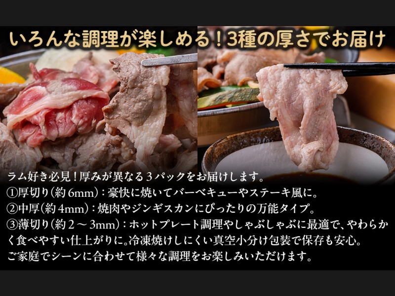 ラム肉の中でも、北海道民誰もが愛する昔ながらの丸いラムスライスで、3パックそれぞれ厚さを変えております。