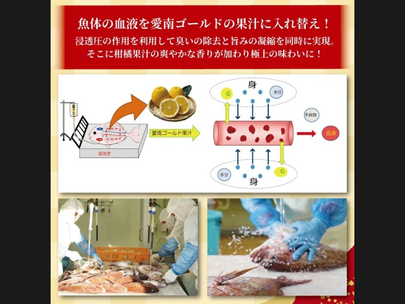 ハマスイの「特許技術」で丁寧に血抜きを行い、そこに愛南ゴールドの果汁を魚の隅々に行き渡らせます。