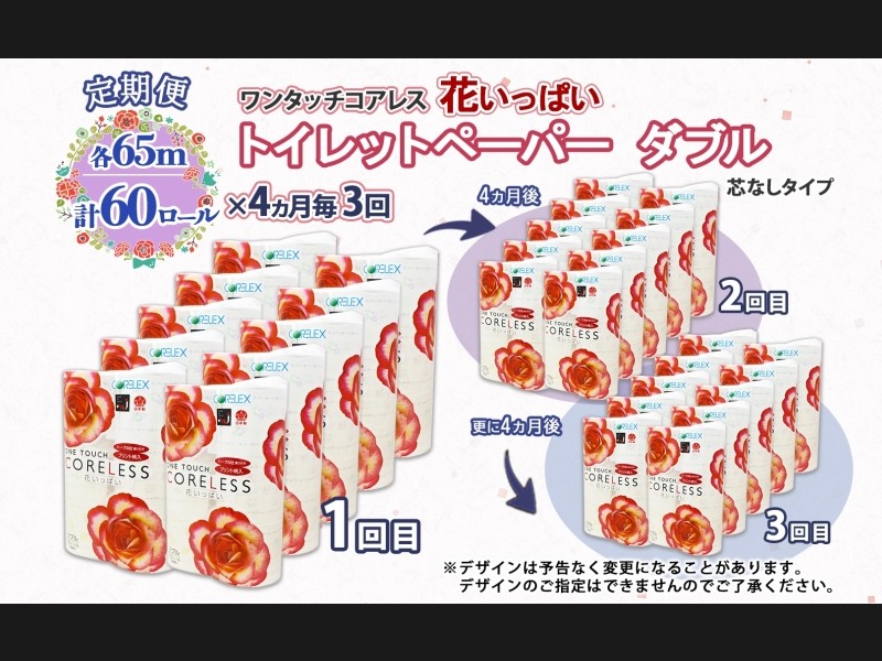 北海道 定期便 4ヵ月毎 全3回 ワンタッチコアレス 花いっぱい トイレットペーパー ダブル 65m巻 60ロー...