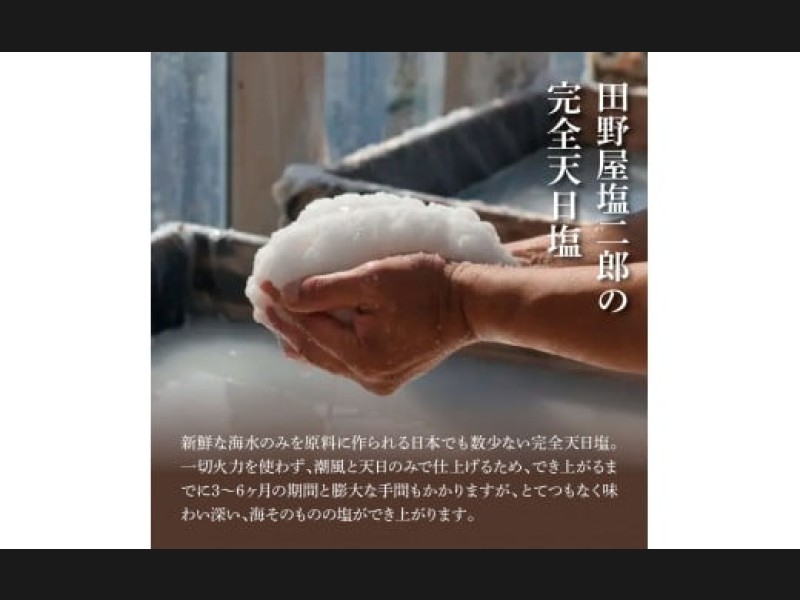 雄大な太平洋に面した高知県田野町で、新鮮な海水のみを原料に作られる日本でも数少ない完全天日塩「田野屋塩二郎」。