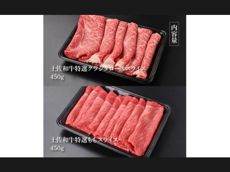 最高級ランクA5の土佐和牛クラシタロースと、もものセットです。各450gの合計900gのボリューム。クラシタロースは別名肩ロースとも呼ばれ、1枚が非常に大きく甘味もコクもたっぷりの逸品。もも肉は柔らかくてジューシー。しかも最高級ランクのもも肉となると、霜降りが入っていて、甘味が加わります。1.6mm程度の厚さでスライスしてますので、すき焼き・しゃぶしゃぶ、どちらでも美味しくお召し上がりいただけます。商品は全て450gずつ、別々にパックされておりますので、お好きな商品からご賞味いただけます