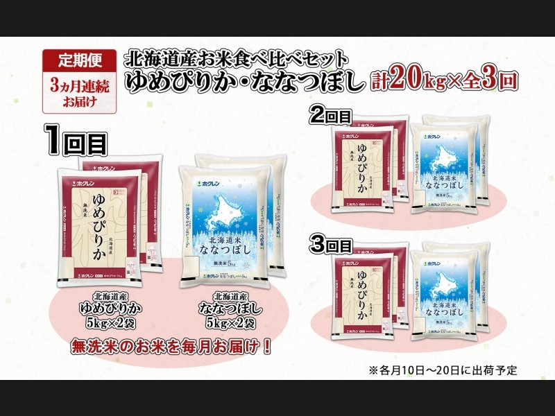定期便 3ヵ月連続3回 北海道産 ゆめぴりか ななつぼし 食べ比べ セット 無洗米 5kg 各2袋 計20kg 米 特A...