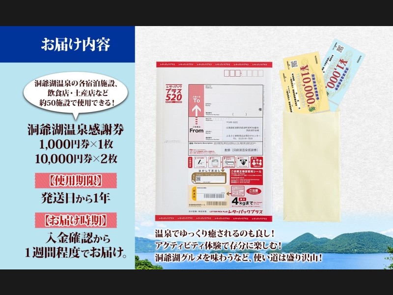 ※寄付お申し込み受付後、一般社団法人 洞爺湖温泉観光協会より温泉感謝券を送付いたします。