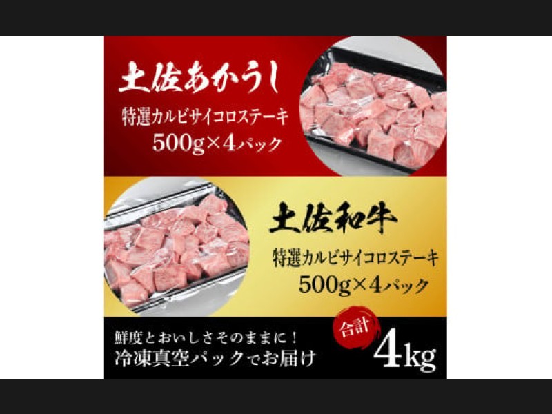 土佐あかうし&土佐和牛2種食べ比べ(500g×8パック)4キロ 4kg 特選カルビサイコロステーキ 特選 カルビ...