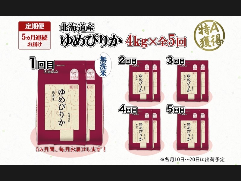 北海道の特A米『ゆめぴりか』無洗米 4kg(2kg×2袋)×全5回をお届けします。