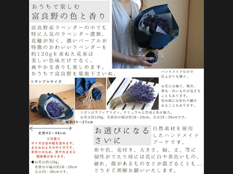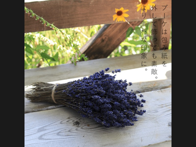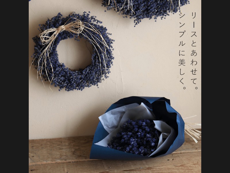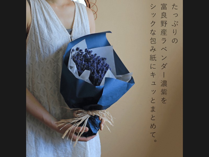およそ120gのラベンダーを一つにまとめて、シックなブルーの包み紙でつつんだ、品のいい大きさのブーケです。