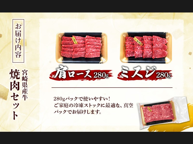 宮崎県産 黒牛 焼肉 赤身 牛肉 焼肉セット 肩ロース ミスジ 2点盛り 560g(280g × 2パック)焼肉用 肉 お...
