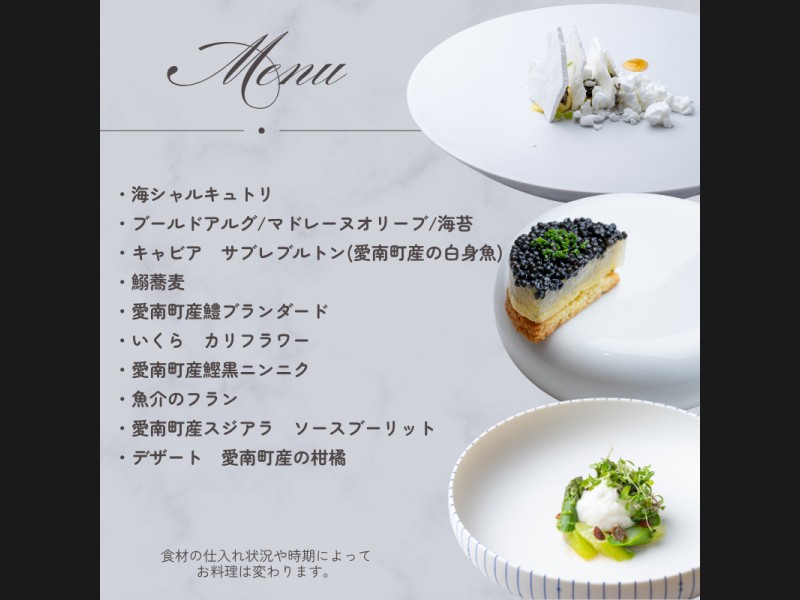 相原シェフ自らが愛南町の一次生産者の現場を訪れ目利きした厳選食材をフルに活用した特別コースです。