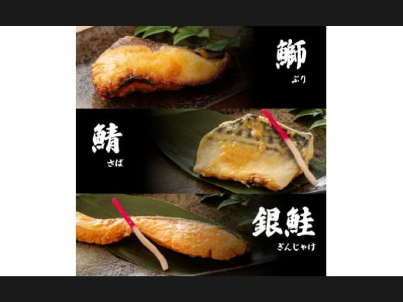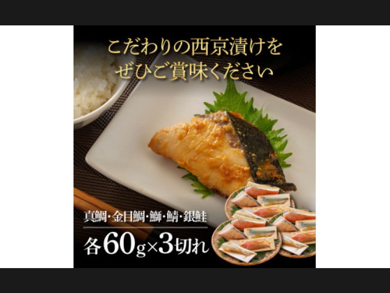 サイズ: 真鯛西京漬け60g×3切、金目鯛西京漬け60g×3切、鰤西京漬け60g×3切、鯖西京漬け60g×3切、銀鮭西京漬け60g×3切