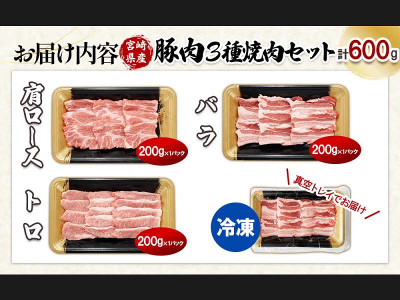 【希少部位・豚トロ入り!】宮崎県産 豚焼肉バラエティセット 600g 真空パック 200gずつの便利な超小分け