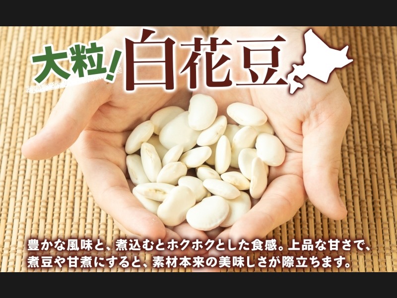 北海道洞爺湖町の豊かな大地で育まれた、大粒で美しい白花豆1kgをお届けします。