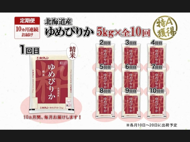北海道の特A米『ゆめぴりか』精米 5kg×全10回をお届けします。