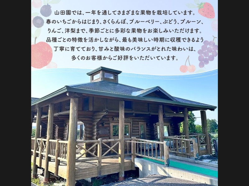 山田園では、一年を通してさまざまな果物を栽培しています。春のいちごからはじまり、さくらんぼ、ブルーベリー、ぶどう、プルーン、りんご、洋梨まで、季節ごとに多彩な果物をお楽しみいただけます。品種ごとの特徴を活かしながら、最も美味しい時期に収穫できるよう丁寧に育てており、甘みと酸味のバランスがとれた味わいは、多くのお客様からご好評をいただいています。