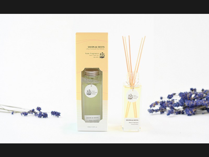 香りのよい、北海道上富良野(かみふらの)町のラベンダー油を配合した、花畑をイメージした香りのルームフレグランス(リードディフューザー)。