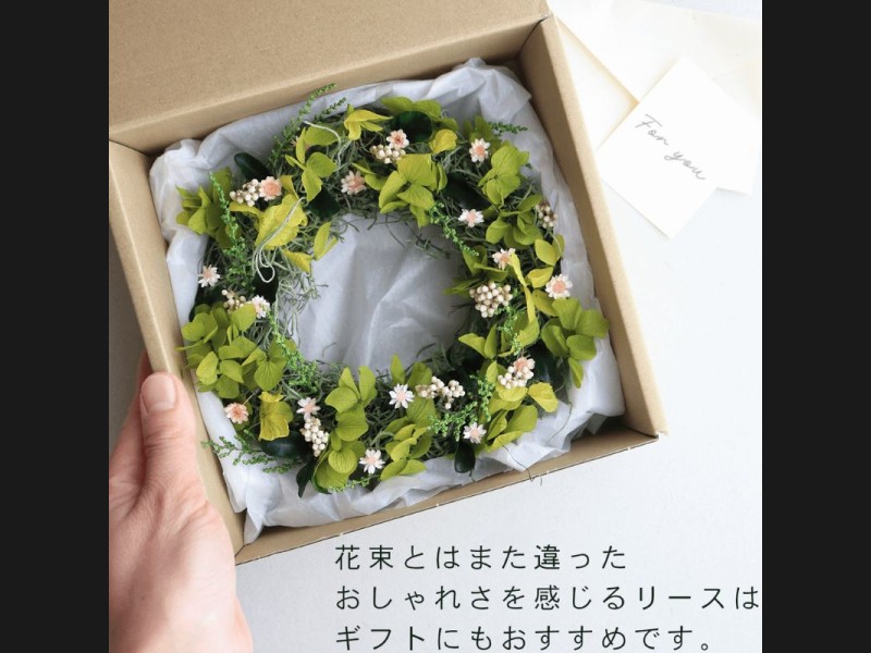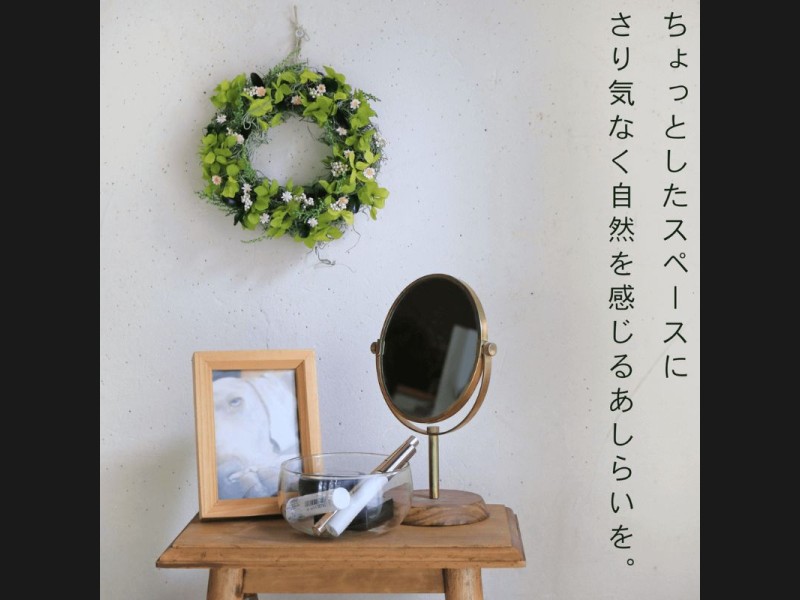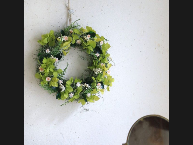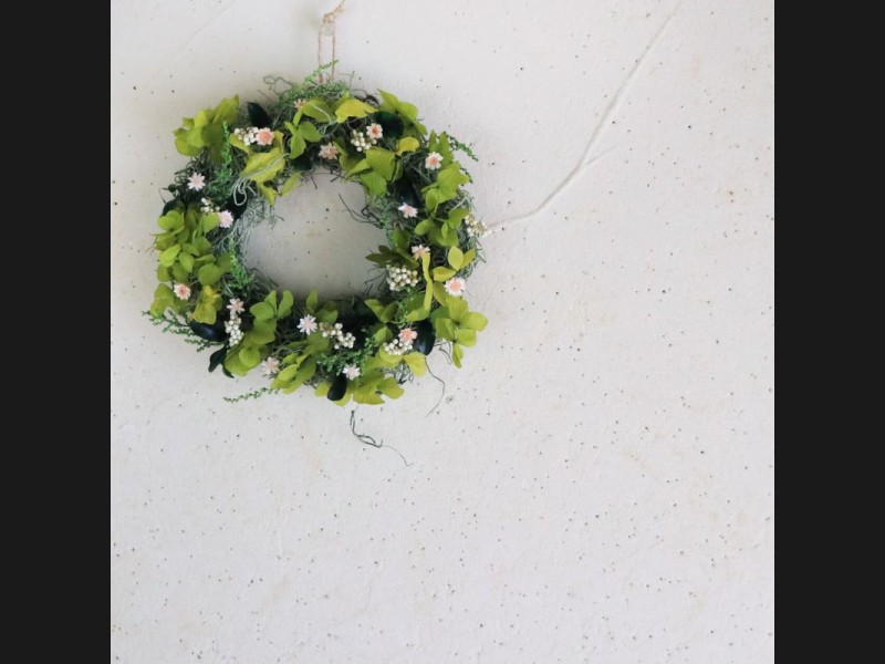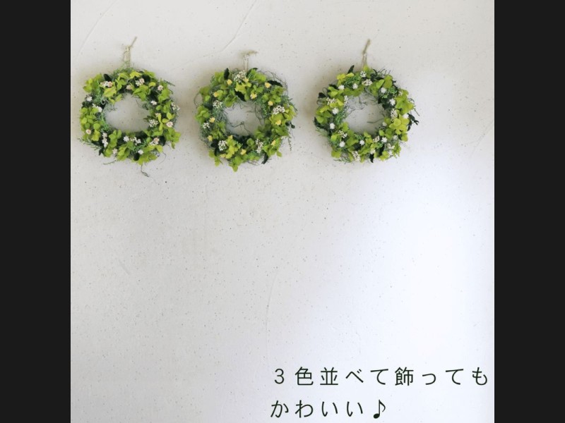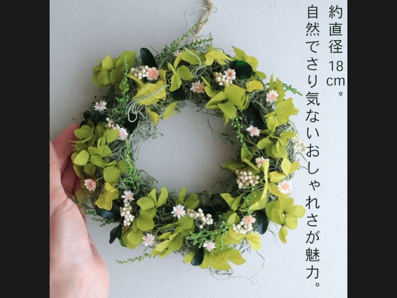 ※つる製のベースにお花やグリーンをひとつずつつけて手作りしていますので、形や大きさ、色に個性があります。
