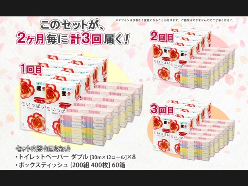 花いっぱい トイレットペーパー(ダブル)計96ロール&ボックスティッシュ 計60箱 ×全3回のお届けです。
