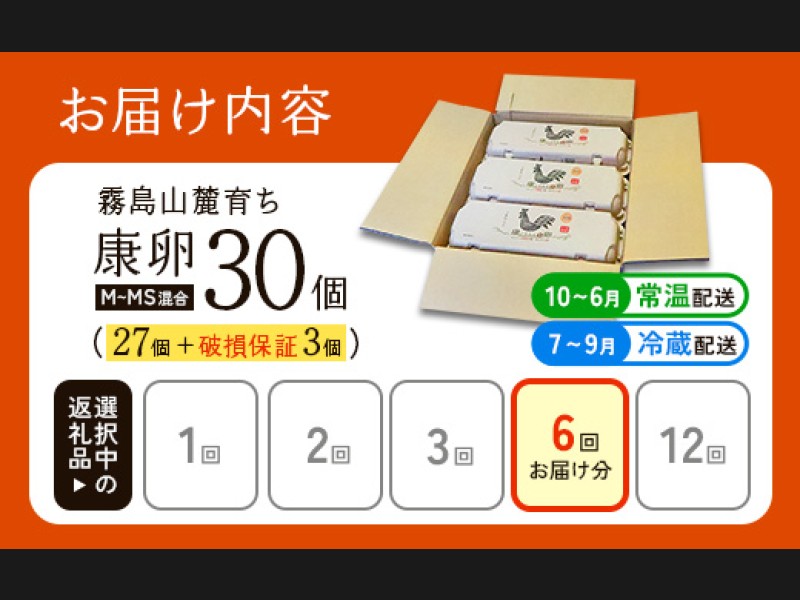 卵【6回定期便】霧島山麓育ち こだわり卵 康卵 計 30個(27個 + 割れ保証 3個)6回 計 180個(162個 + ...