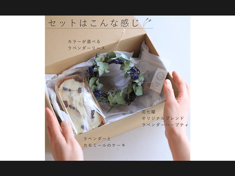 富良野花七曜がお届けする、富良野産ラベンダーがたっぷり楽しめるリースとケーキ・ハーブティの3点セットです。