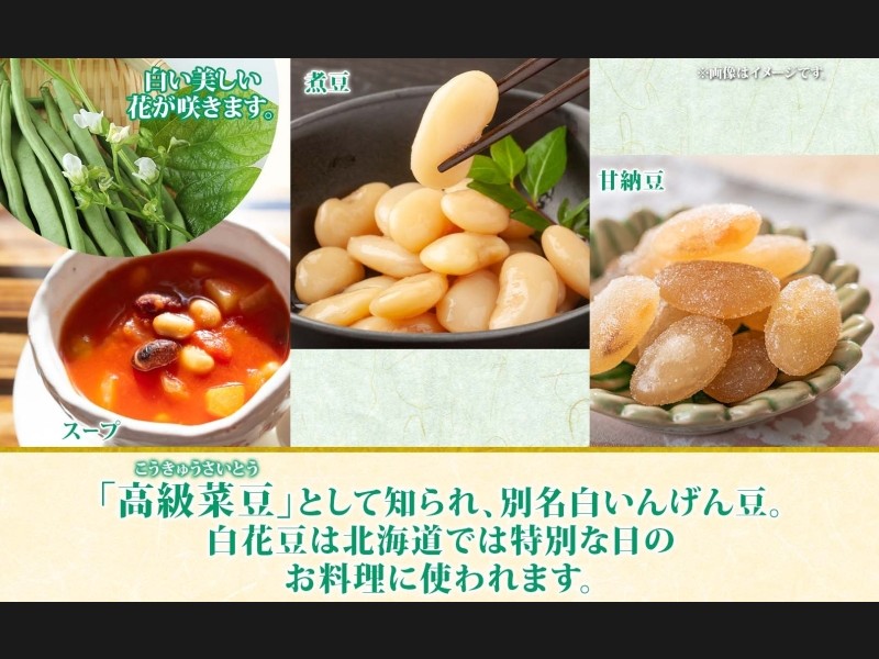 白花豆は、地元の洞爺湖町では、甘く煮付ける「煮豆」が一般的ですが、そのほかにも、豆のスープなど、様々なお料理に使っていただけます。