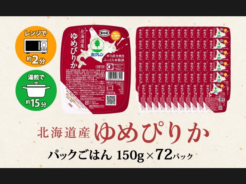 北海道産 『ゆめぴりか』パックごはん 150g×計72パックセットです。
