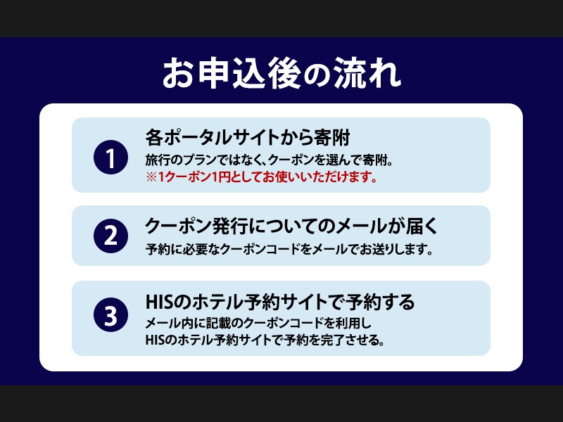 ※「HISふるさと納税宿泊予約専用クーポン」についての情報はメールで送信されます。物理的な配送は行われません。