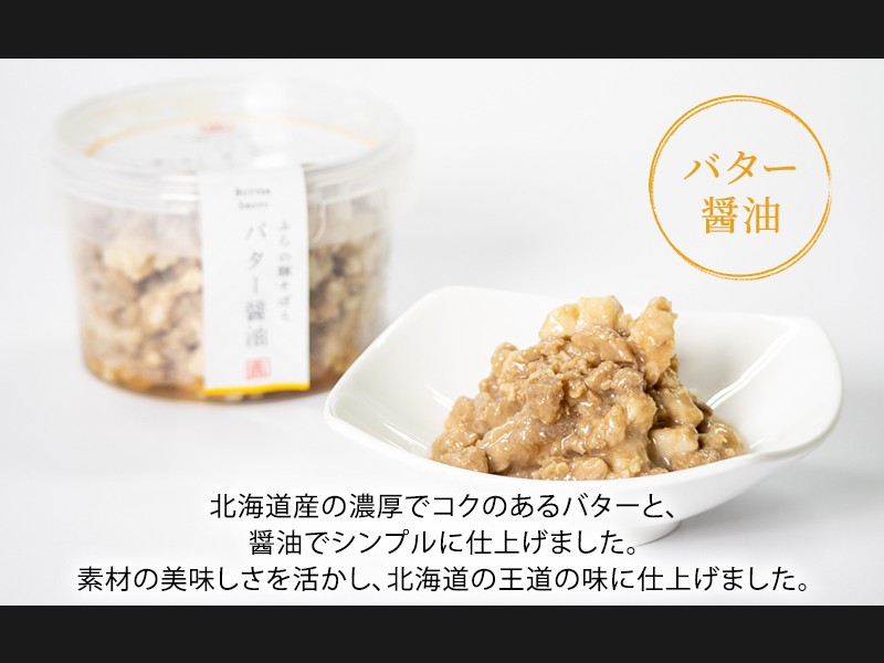 ふらの豚そぼろは、クセのないさっぱりとした肉質が特徴のかみふらのポークを手作業で粗挽きにして、異なる3種類のソースと絡めた贅沢なご飯のお供です。