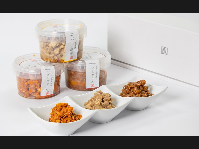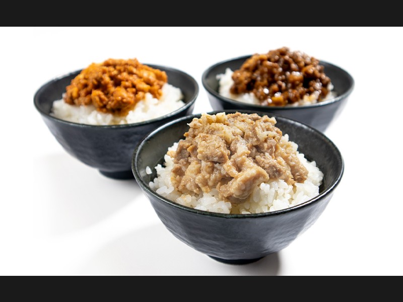バター醤油、デミグラス、コチュジャンベースのピリ辛ナッツ、異なる3種の味つけをした豚そぼろはご飯のお供としてはもちろん、