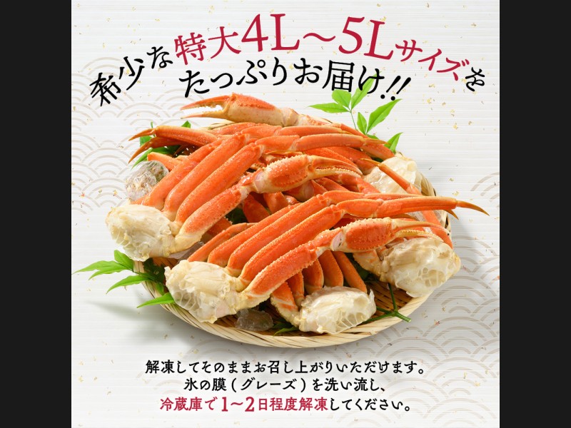 地域によっては越前がにや松葉がになどとも呼ばれるカニの女王、本ずわいがに!その中でも希少な特大4L~5Lサイズをたっぷりお届けします!ボイル済みなので、解凍してそのままお召し上がりいただけます。※脚が折れている場合、肩の形に合わせた「差脚(さしあし)」を含みます。
