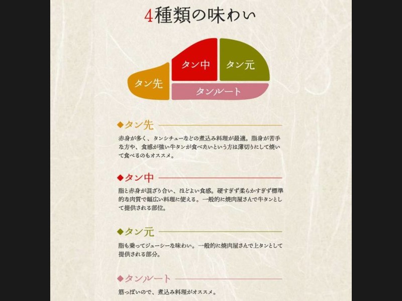 赤身が多く煮込み料理に最適なタン先、ほどよい食感が焼肉にぴったりなタン中、いわゆる上タンのタン元、煮込み料理におすすめタンルートの4種類の味わいが楽しめます。