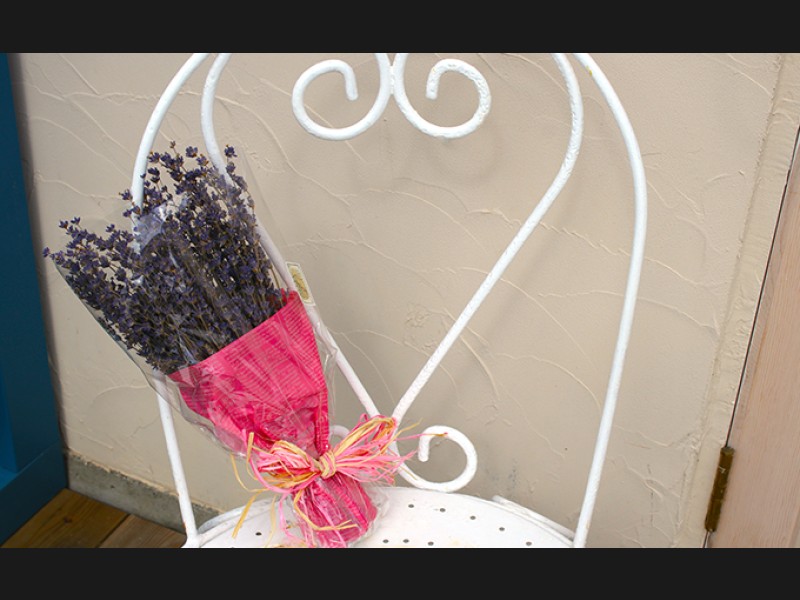 自家栽培のラベンダーを刈り取り、ドライフラワーに加工し、ブーケにするまでを町内のお店で手作りしている製品のため。