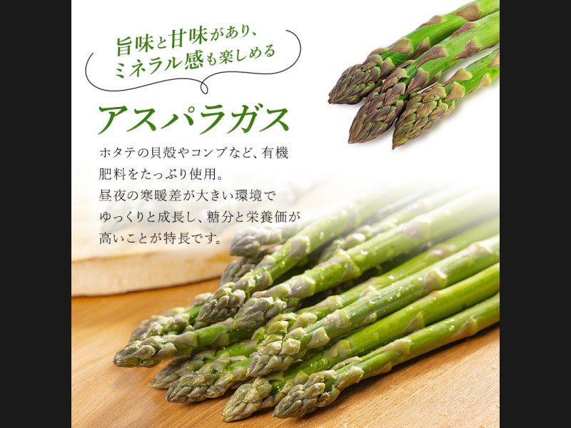 グリーンアスパラとは違った旨みがあり、缶詰とはまったく異なる、繊細な味わいとシャキッとした食感を楽しめます。