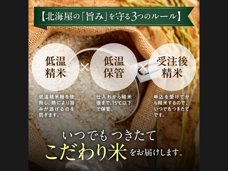 お米は精米後、時間が経ってしまうとどんどん味が落ちていきます。少しでも長く美味しい期間を保てるよう、北海屋では申し込みを承ってから精米しています。