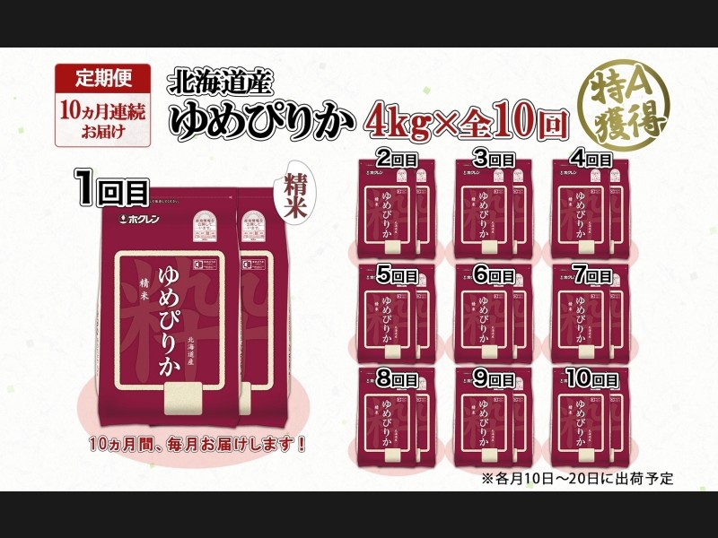 北海道の特A米『ゆめぴりか』精米 4kg(2kg×2袋)×全10回をお届けします。