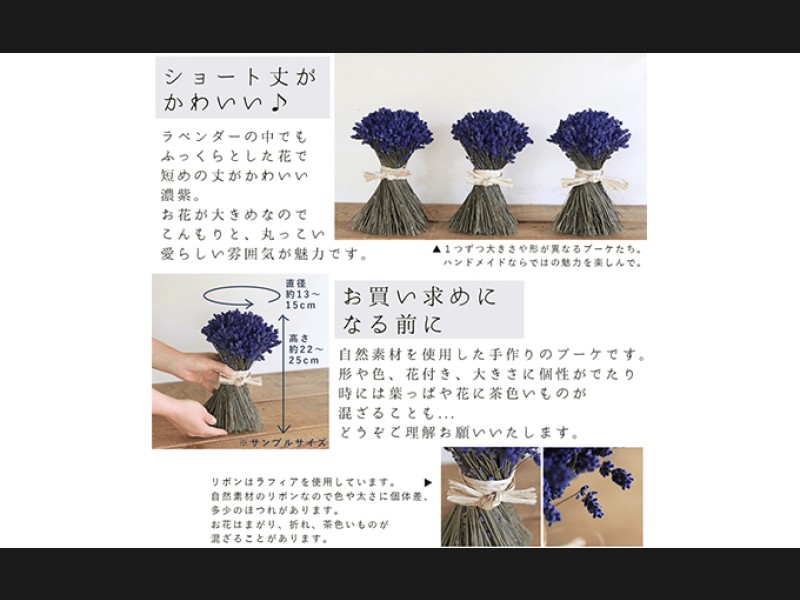 ※ドライフラワーは自然の植物ですので、それぞれに形や大きさ、色、枝ぶり、花の開き具合に個性があります。多少茶色っぽいものや首が垂れているものが含まれることがあります。