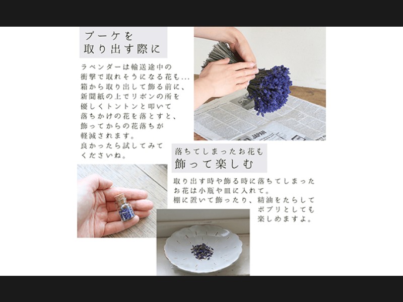 ※ドライフラワーですので若干お花が落ちます。軽く逆さに振って落ちそうな花を落としてから飾ると、落ちにくくなります。