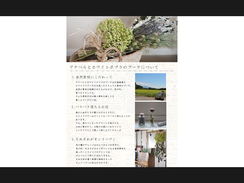※ドライフラワーは自然の植物ですので、それぞれに形や大きさ、色、枝ぶり、花の開き具合に個性があります。