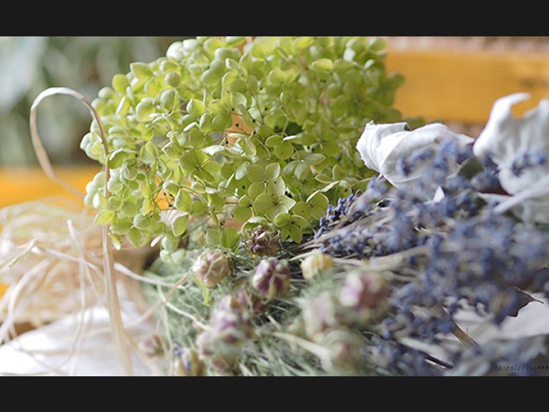 北海道産のあじさいアナベルやホワイトポプラをメインに、ニゲラやブロムスグラス、差し色に富良野産のラベンダーを添えて。