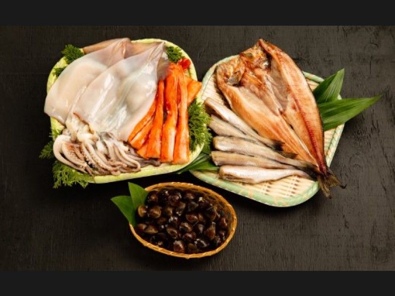 サイズ: 一夜干しほっけ開き1枚、一夜干しイカ開き2枚、一夜干し姫タラ5本、冷凍砂出ししじみ250g、一夜干しサーモンハラスみりん200g