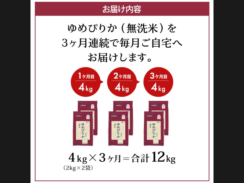 3ヵ月 定期便 (無洗米4kg)ホクレンゆめぴりか(無洗米2kg×2袋)袋はチャック付 米 お米 白米 ごはん ご飯 ...