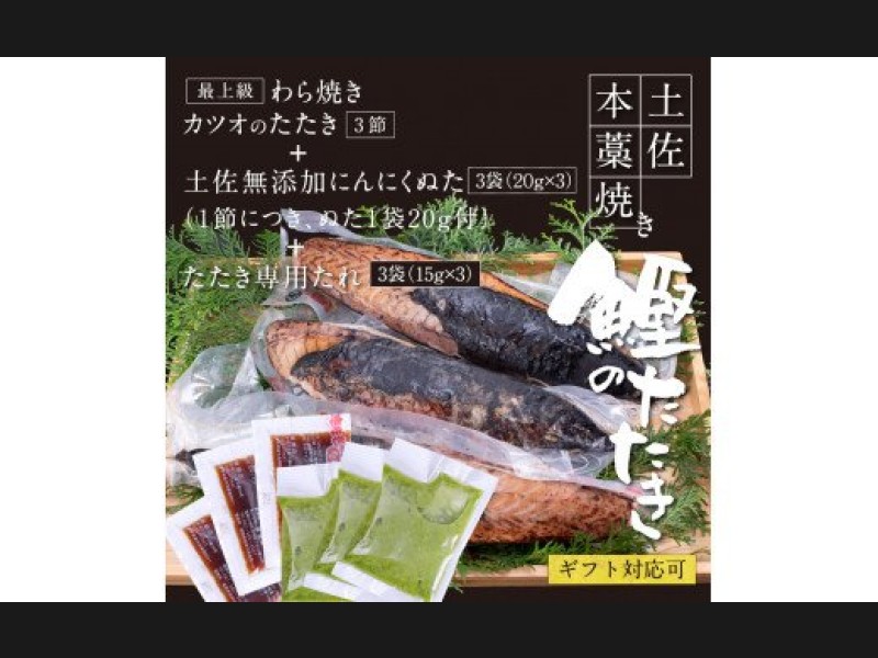 サイズ: かつおのたたき×3節(鰹の大きさには個体差があり、1節約320g~360g以上)、有機無添加土佐にんにくぬた 20ml×3袋、たたきのタレ15ml×3袋、おろしニンニク2g×3袋