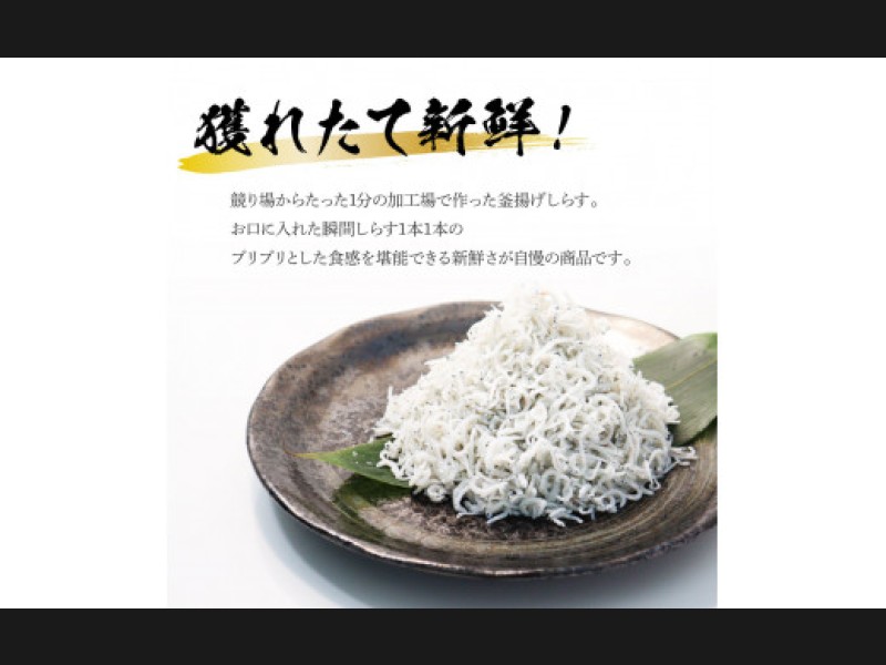 競り場からたった1分の加工場で作った釜揚げしらす。お口に入れた瞬間しらす1本1本のプリプリとした食感を堪能できる新鮮さが自慢の商品です。
