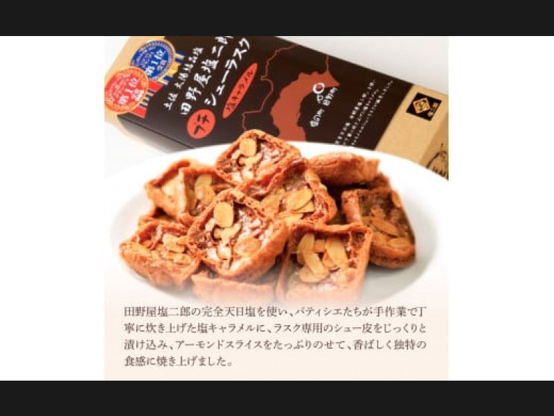 その絶品天日塩を使い、パティシエたちが手作業で丁寧に炊き上げた塩キャラメルに、ラスク専用のシュー皮をじっくりと漬け込み、アーモンドスライスをたっぷりのせて、香ばしく独特の食感に焼き上げました。