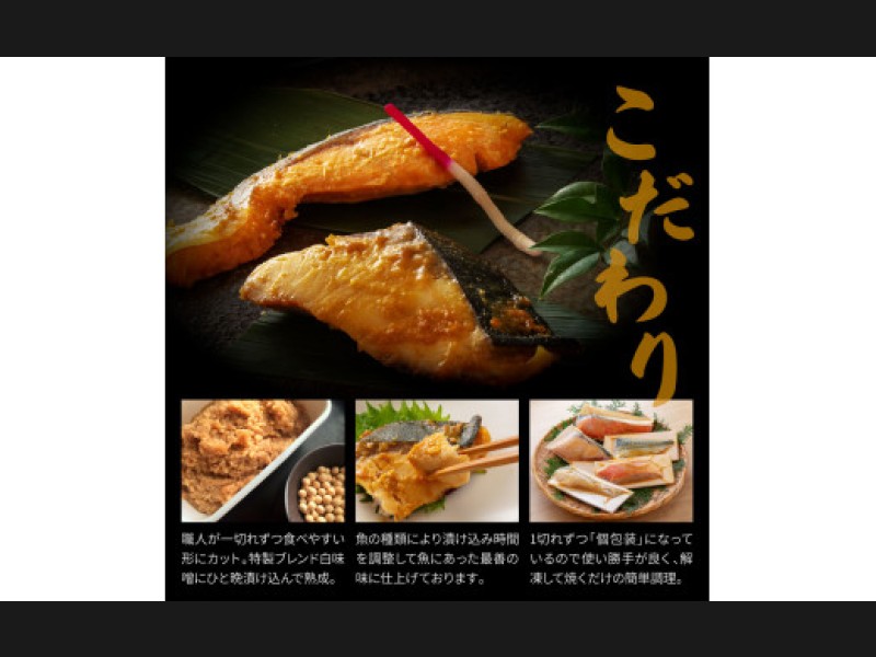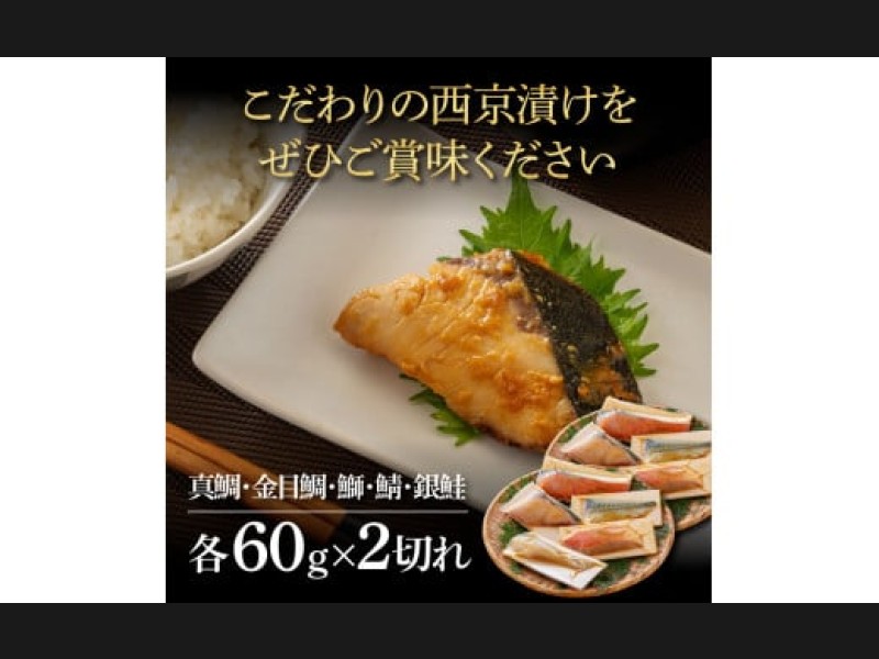 サイズ: 真鯛西京漬け60g×2切、金目鯛西京漬け60g×2切、鰤西京漬け60g×2切、鯖西京漬け60g×2切、銀鮭西京漬け60g×2切