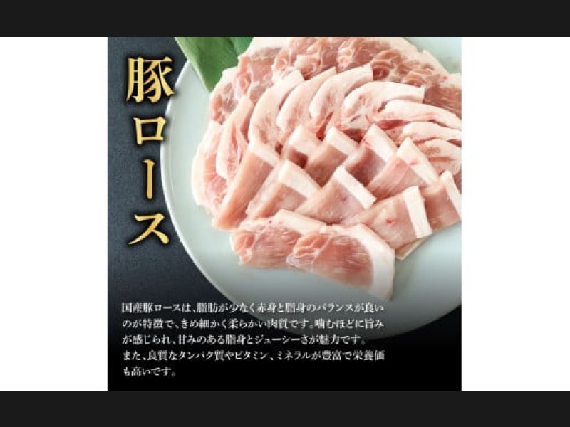 国産豚ロースは、豚肉の中では脂肪が少なく、赤身と脂身のバランスが良いのが特徴です。肉質は、きめ細かくてやわらかいのが一般的で、噛むほどに肉の旨みが感じられます。脂身の部分には甘みがあり、豚肉特有のジューシーさも魅力的で、豚肉独特の風味を楽しむことができます。栄養価も高く、良質のタンパク質をはじめとするビタミンやミネラルも豊富に含まれており、栄養バランスも考えながら、美味しく楽しむことができます。